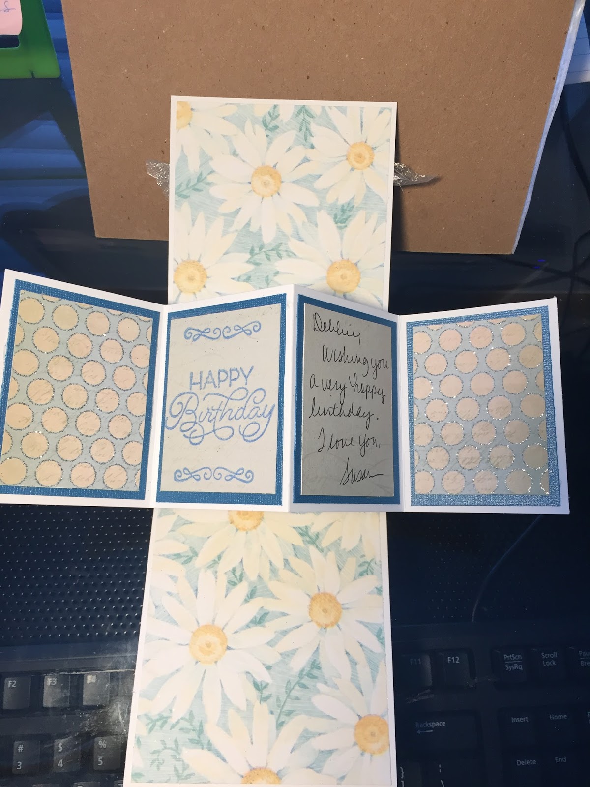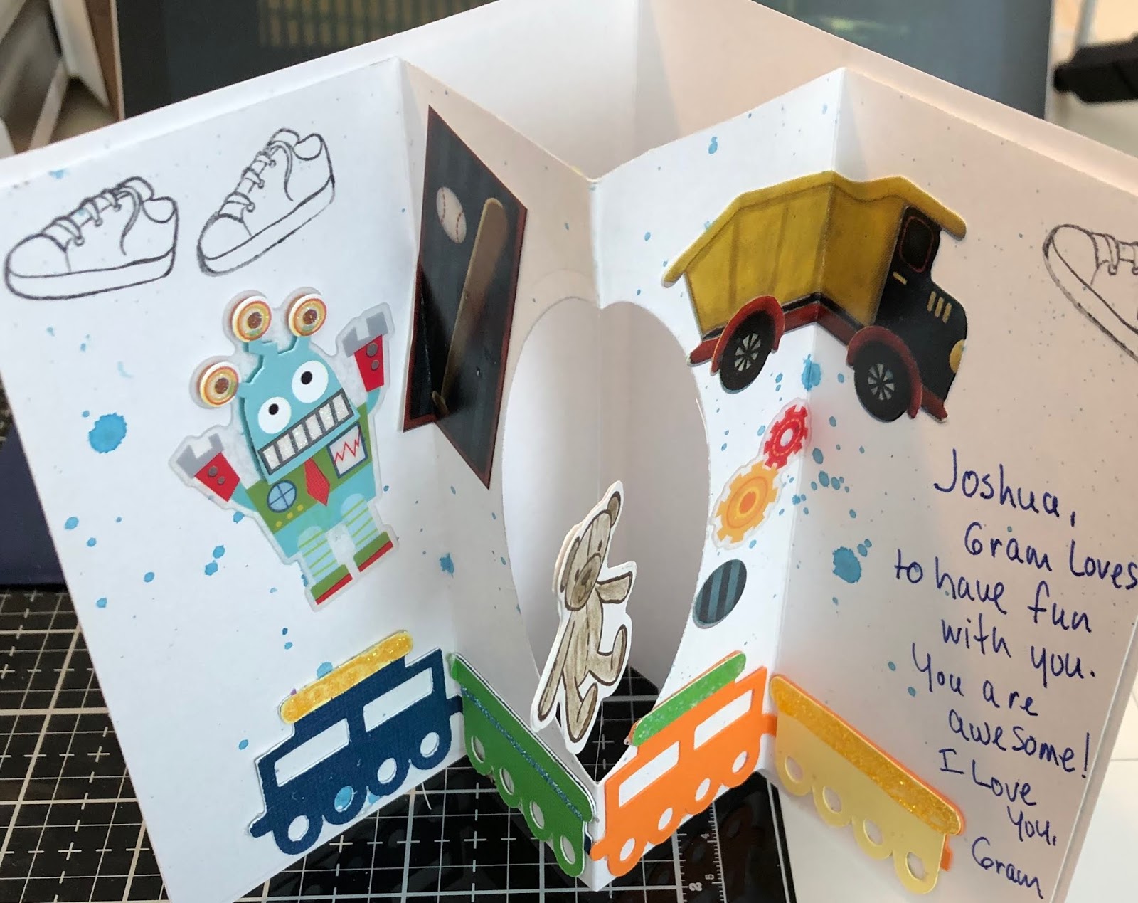 The second card was a mock-up of a spinner card. I was following Jennifer McGuire's instructions (but don't just her on my work LOL). It's a card for my grandson showing some of the things we do together.
